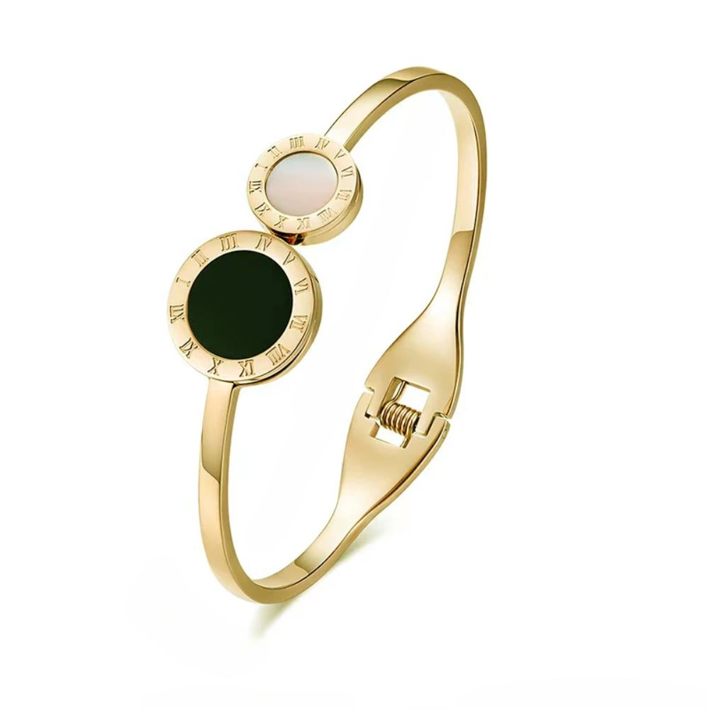 Descubre la sofisticación de nuestro Brazalete Noche y Día. Este brazalete de acero inoxidable chapado en oro presenta un diseño moderno que combina elegancia y contraste entre el negro y el dorado. Perfecto para cualquier ocasión, añade un toque distintivo y refinado a tu estilo diario o a tus conjuntos de noche.